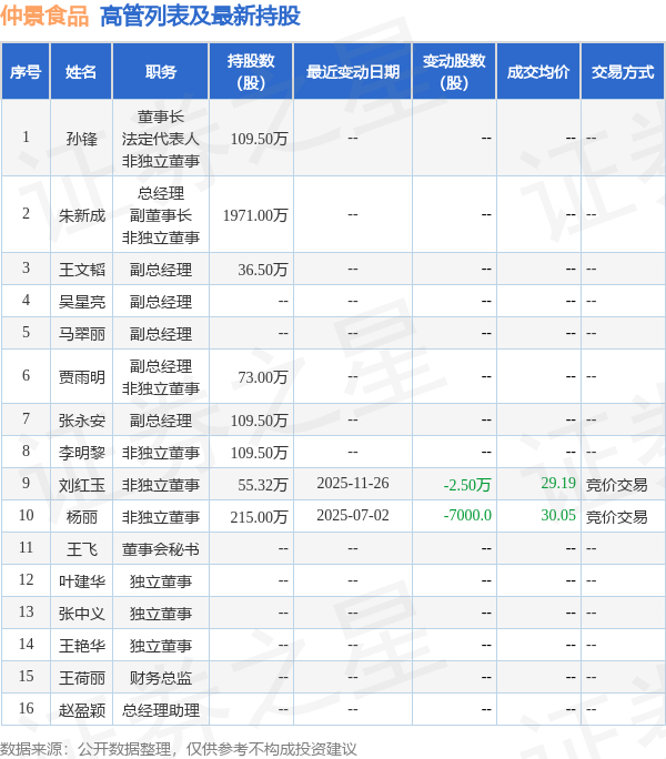 证券之星消息,根据11月27日市场公开信息、上市公司公告及交易所披露数据整理,仲景食品(300908)最新董监高及相关人员股份变动情况:2025年11月26日公司董事刘红玉共减持公司股份2.5万股,占公司总股本为0.0171%。变动期间公司股价上涨0.24%,11月26日当日收盘报28.97元。