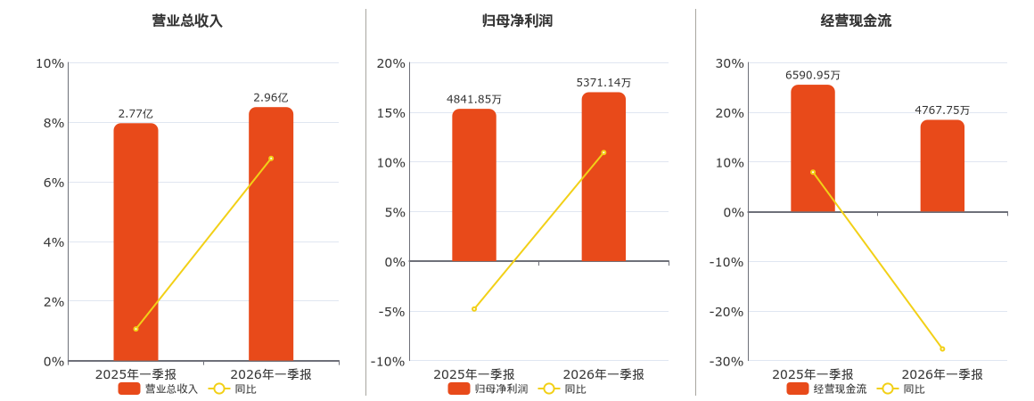 公司营业总收入为2.96亿元,较去年同报告期营业总收入增加1878.75万元,实现4年连续上涨,同比较去年同期上涨6.78%。归母净利润为5371.14万元,较去年同报告期归母净利润增加529.29万元,同比较去年同期上涨10.93%。经营活动现金净流入为4767.75万元。