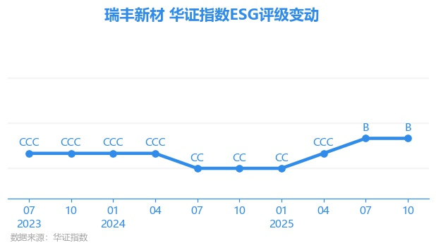 日前,华证指数公布了新一期(2025年10月31日)的ESG评级结果,瑞丰新材(300910.SZ)获得B评级(华证指数评级为C起至AAA九档,C为最低档,AAA为其最高一级评级/AA为其第二档),上一期(2025年7月31日)ESG评级为B。本期ESG评级在494家化学制品行业A股上市公司中排名第232(上一期排名第217)。