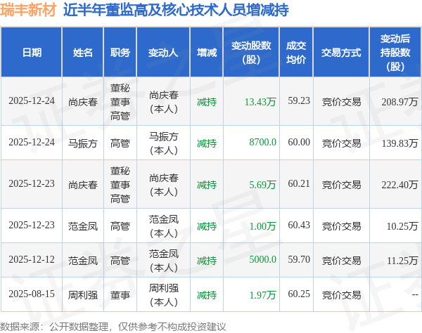 瑞丰新材近半年内的董监高及核心技术人员增减持详情如下: