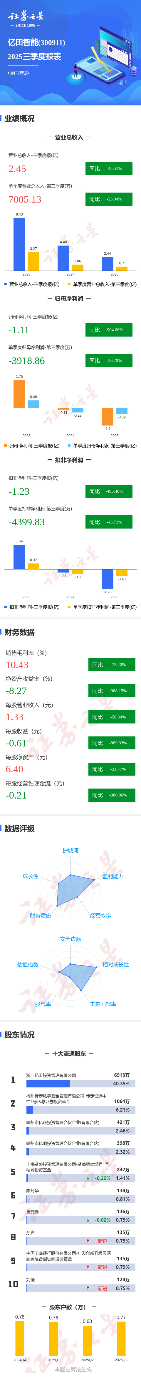 证券之星消息,亿田智能2025年三季报显示,前三季度公司主营收入2.45亿元,同比下降45.52%;归母净利润-1.11亿元,同比下降904.67%;扣非净利润-1.23亿元,同比下降495.49%;其中2025年第三季度,公司单季度主营收入7005.13万元,同比下降33.95%;单季度归母净利润-3918.86万元,同比下降36.79%;单季度扣非净利润-4399.83万元,同比下降43.72%;负债率42.42%,投资收益299.47万元,财务费用1701.18万元,毛利率10.43%。