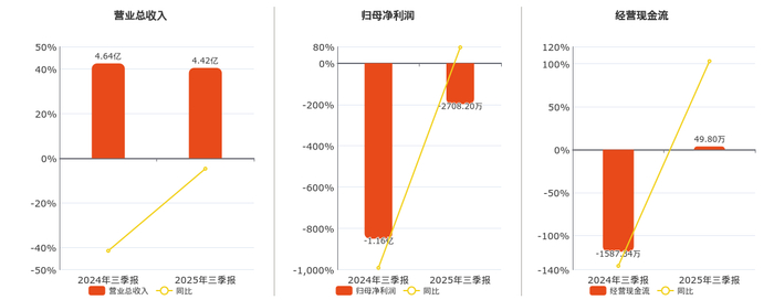 公司营业总收入为4.42亿元,较去年同报告期营业总收入减少2178.76万元,同比较去年同期下降4.70%。归母净利润为-2708.20万元。经营活动现金净流入为49.80万元。