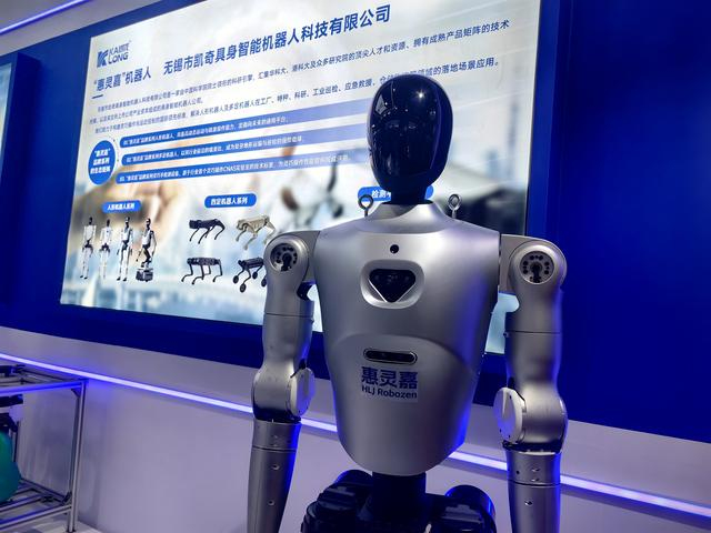在博览会上,凯奇具身智能推出的“惠灵嘉”系列人形机器人和多足机器人颇受与会者关注,时不时都会有人前来合影拍照。