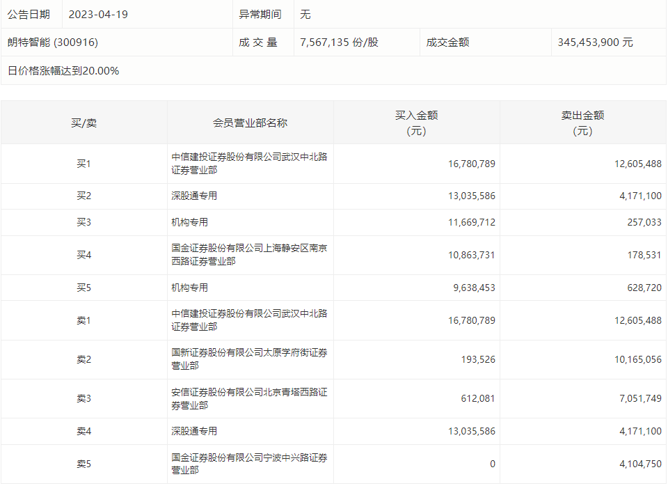4月19日,朗特智能今日涨停,龙虎榜数据显示,上榜营业部席位全天成交1.02亿元,占当日总成交金额比例为29.51%。其中,买入金额为6279.39万元,卖出金额为3916.24万元,合计净买入2363.15万元。