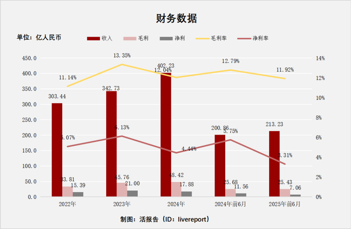 来源:LiveReport大数据公司近三年营收、毛利稳健增长,但2024年净利润同比下滑14.89%,主要是毛利增速放缓,销售开支及行政开支因海外业务扩张而增加;2025年上半年收入增长放缓,净利润也进一步下滑。