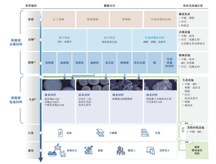 公司是一家新能源材料公司。公司主要从事于以正极活性材料前驱体(pCAM)为核心的新能源电池材料的研究及开发(研发)、生产及销售,以及新能源金属产品。公司是锂离子电池用镍系和钴系正极活性材料前驱体(pCAM)的全球领导者,自2020年起连续五年出货量排名第一,就2024年的镍系pCAM及钴系pCAM而言分别占市场份额的20.3%及28.0%(1)。就全部pCAM产品的销量而言,公司于2024年全球排名第一,占市场份额的21.8%。