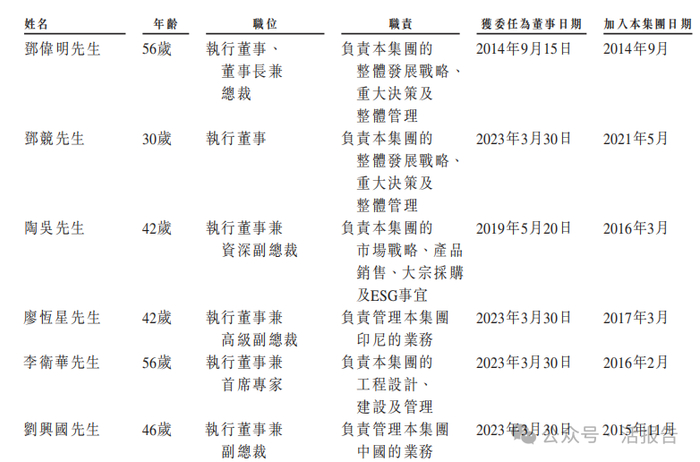 董事会由十名董事组成,包括六名执行董事及四名独立非执行董事;其中邓伟明为公司董事长、执行董事兼总裁,其主要负责公司的整体发展策略、重大决策及整体管理。