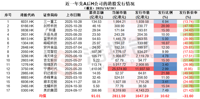 截至2025年10月23日,近一年赴港成功上市的共计15家,平均H股发行的折价率约为31.75%。