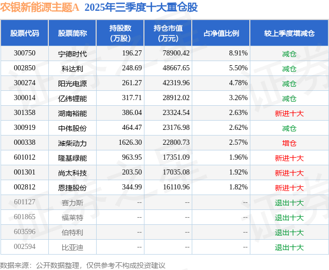 农银新能源主题A的前十大重仓股如下: