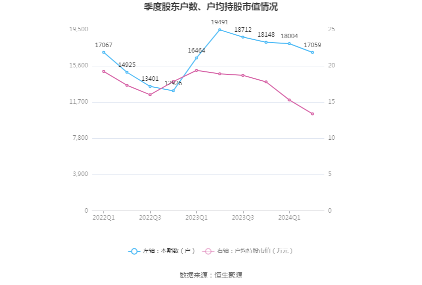 筹码集中度方面,截至2024年上半年末,公司股东总户数为1.71万户,较一季度末下降了945户,降幅5.25%;户均持股市值由一季度末的15.31万元下降至13.39万元,降幅为12.54%。