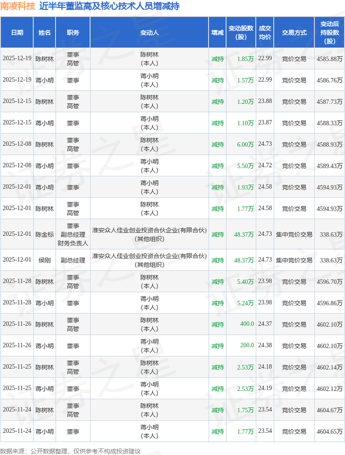 南凌科技近半年内的董监高及核心技术人员增减持详情如下: