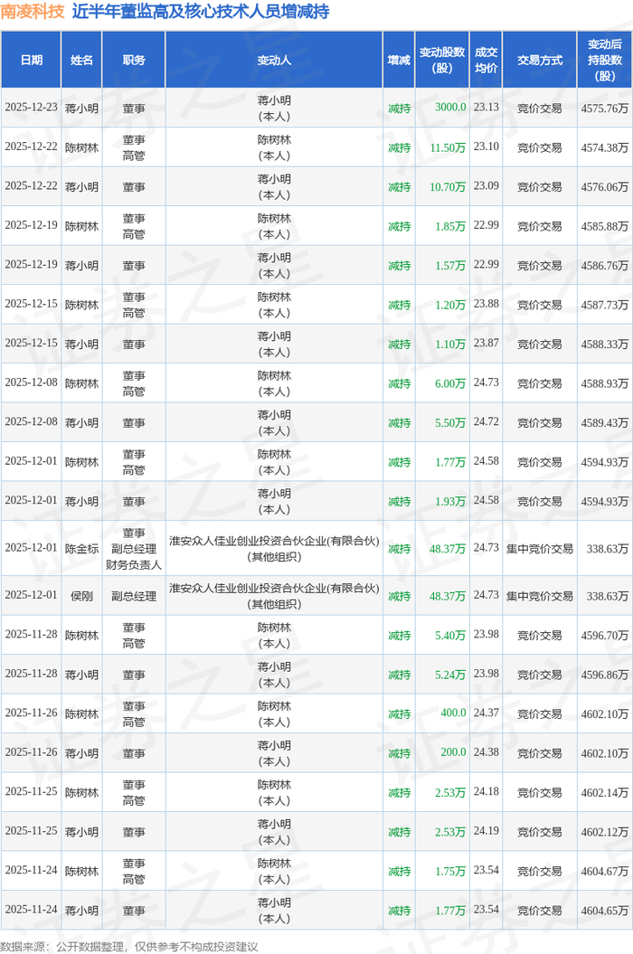 南凌科技:12月23日高管蒋小明减持股份合计3000股