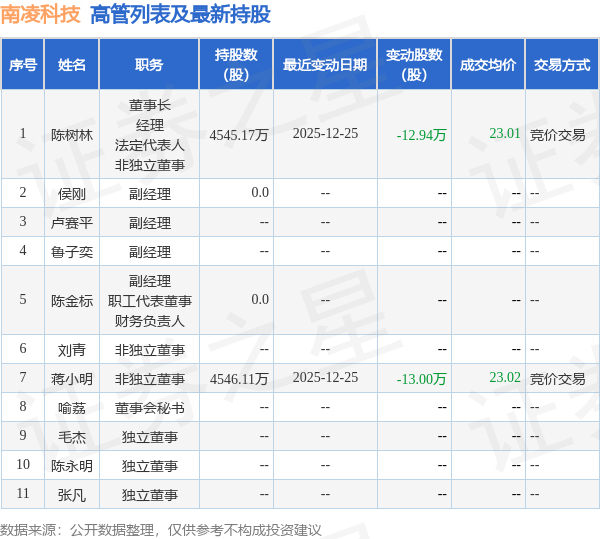 南凌科技的高管列表及最新持股情况如下: