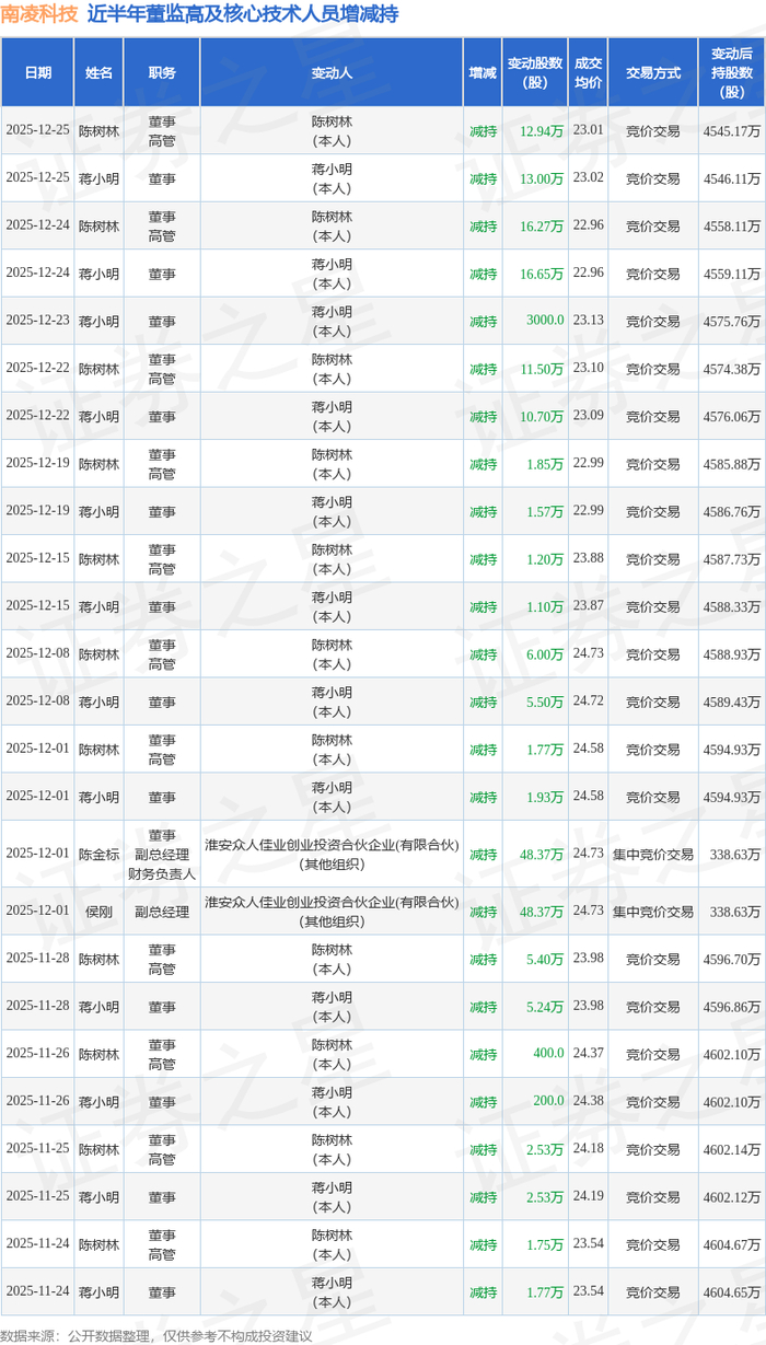 南凌科技:12月25日高管陈树林、蒋小明减持股份合计25.94万股