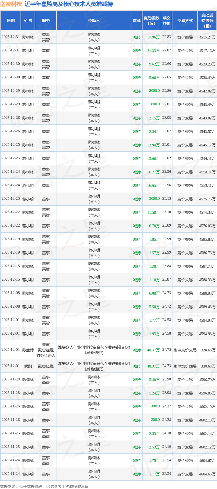 南凌科技近半年内的董监高及核心技术人员增减持详情如下: