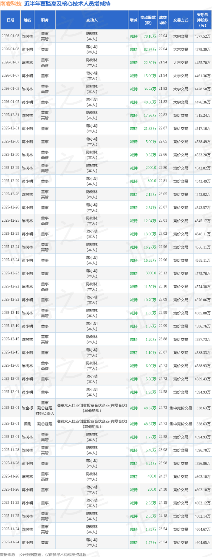 南凌科技近半年内的董监高及核心技术人员增减持详情如下: