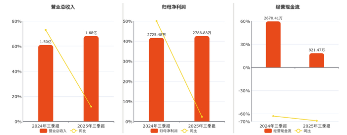 公司营业总收入为1.68亿元,在已披露的同业公司中排名第9。归母净利润为2786.88万元。经营活动现金净流入为821.47万元,较去年同报告期经营活动现金净流入减少1848.94万元,同比较去年同期下降69.24%。