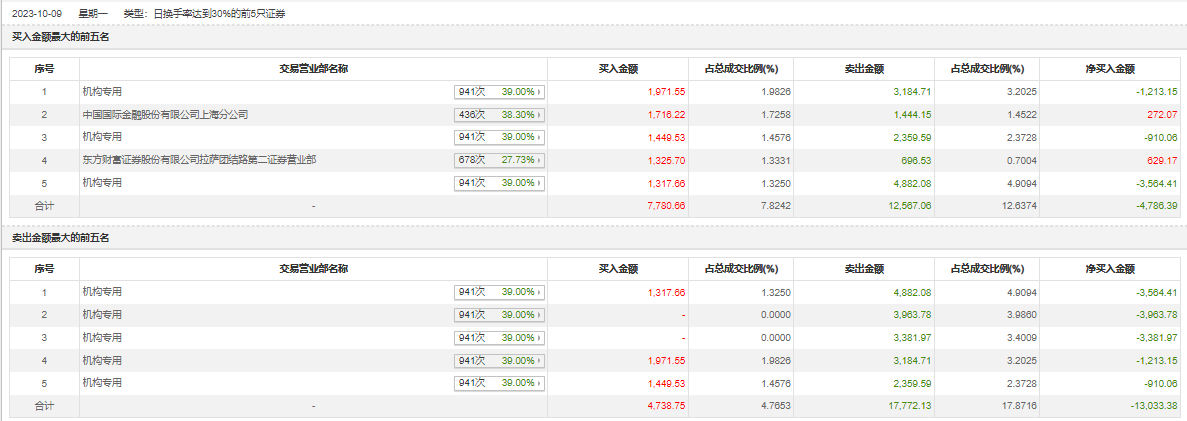 具体来看,机构买入4738.75万元,卖出1.78亿元,合计净卖出1.3亿元。此外,中国国际金融上海分公司、东方财富证券拉萨团结路第二证券营业部分别买入1716.22万元、1325.70万元;中国国际金融上海分公司、东方财富证券拉萨团结路第二证券营业部分别卖出1444.15万元、696.53万元。