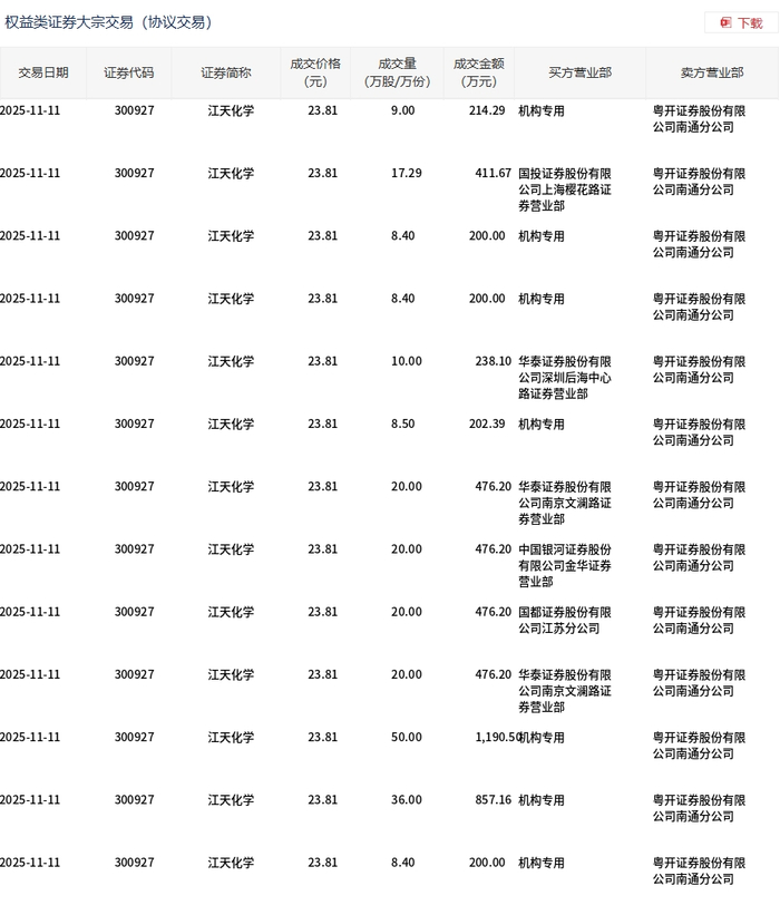 11月11日,江天化学大宗交易成交235.99万股,成交额5618.91万元,占当日总成交额的11.95%,成交价23.81元,较市场收盘价30.95元折价23.07%。