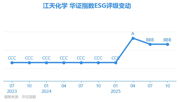 日前,华证指数公布了新一期(2025年10月31日)的ESG评级结果,江天化学(300927.SZ)获得BBB评级(华证指数评级为C起至AAA九档,C为最低档,AAA为其最高一级评级/AA为其第二档),上一期(2025年7月31日)ESG评级为BBB。本期ESG评级在494家化学制品行业A股上市公司中排名第100(上一期排名第94)。
