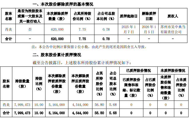 日前发布公告称,公司持股5%以上股东肖炎,其所持有的62万股公司股份办理了解除质押业务。具体情况公告如下: