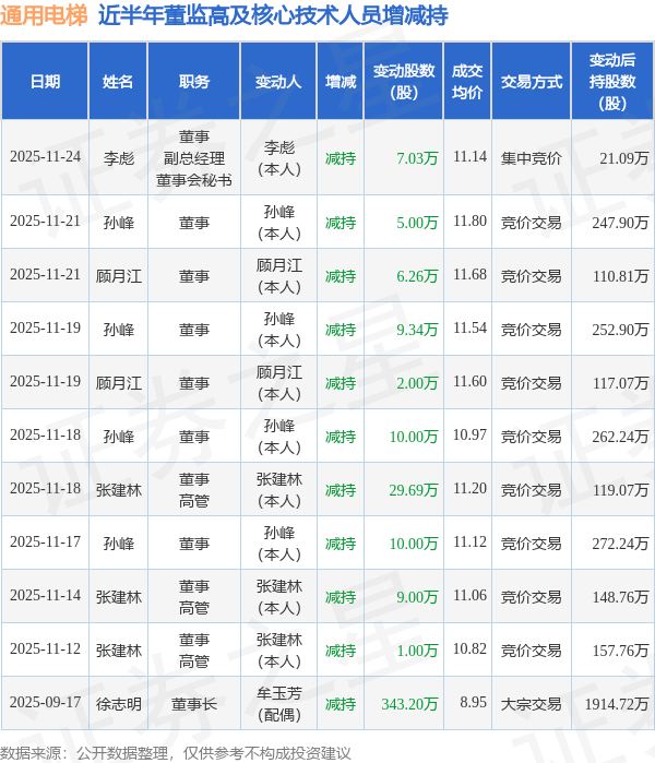 通用电梯近半年内的董监高及核心技术人员增减持详情如下:
