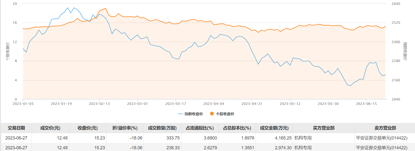 6月27日大宗交易成交572.08万股,成交额7139.55万元,占当日总成交额的78.06%,成交价12.48元,较市场收盘价15.23元折价18.06%。