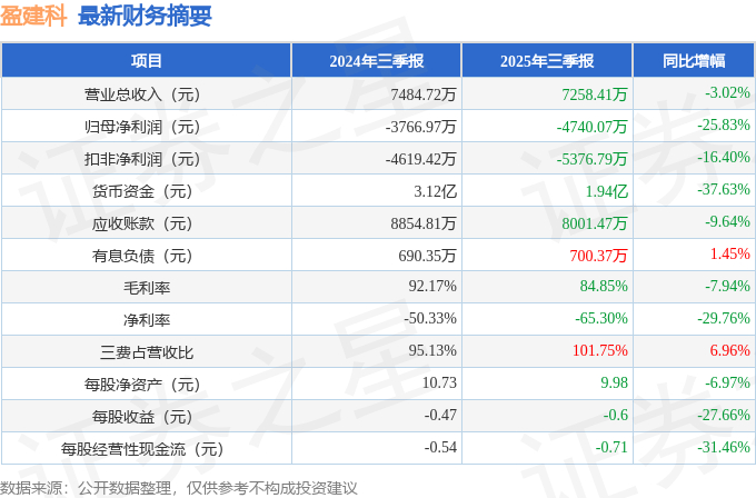 据证券之星公开数据整理,近期盈建科(300935)发布2025年三季报。截至本报告期末,公司营业总收入7258.41万元,同比下降3.02%,归母净利润-4740.07万元,同比下降25.83%。按单季度数据看,第三季度营业总收入2413.52万元,同比下降0.76%,第三季度归母净利润-1502.43万元,同比下降14.3%。本报告期盈建科公司应收账款体量较大,当期应收账款占最新年报营业总收入比达59.79%。