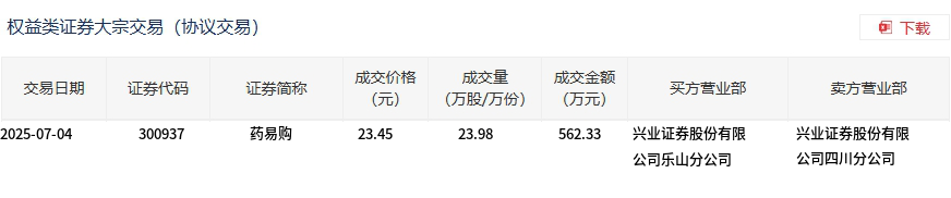 药易购今日大宗交易折价成交23.98万股,成交额562.33万元