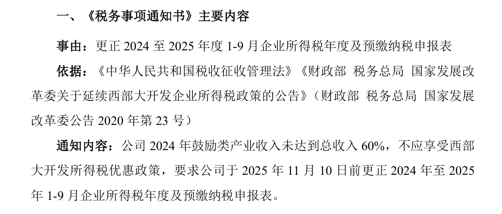 《税务事项通知书》指出,药易购2024年鼓励类产业收入未达到总收入60%,不应享受西部大开发所得税优惠政策。公司需于2025年11月10日前更正2024年至2025年1月~9月企业所得税年度及预缴纳税申报表。
