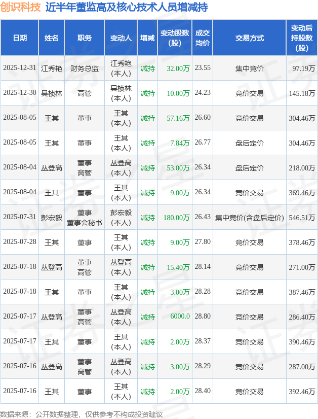 创识科技近半年内的董监高及核心技术人员增减持详情如下: