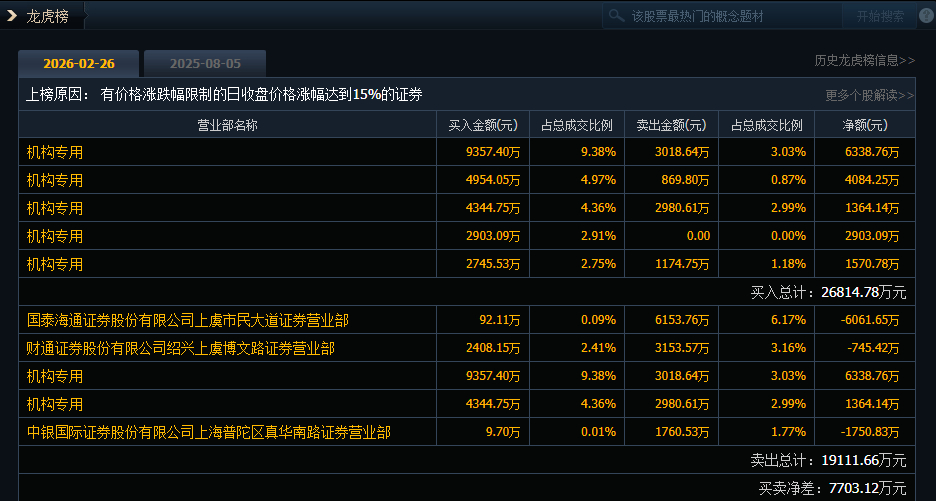 春晖智控今日20cm涨停,5家机构专用席位净买入1.63亿元