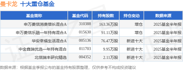 根据2025基金半年报公募基金重仓股数据,重仓该股的公募基金共5家,其中持有数量最多的公募基金为申万菱信基金的申万菱信消费增长混合A。申万菱信消费增长混合A目前规模为1.63亿元,最新净值1.493(9月30日),较上一交易日上涨0.27%,近一年上涨34.99%。该公募基金现任基金经理为刘含。刘含在任的基金产品包括:申万菱信乐融一年持有混合A,管理时间为2023年11月29日至今,期间收益率为61.11%。