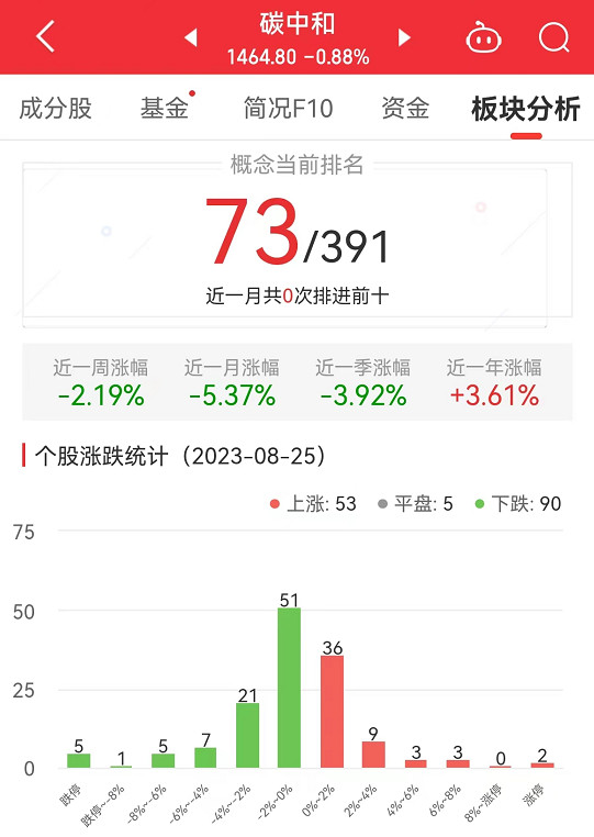 中国经济网北京8月25日讯 今日,碳中和板块整体跌幅0.88%,其中,53只股票上涨,5只股票平盘,90只股票下跌。
