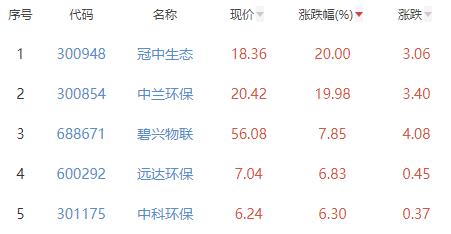 其中,冠中生态、中兰环保、碧兴物联、远达环保、中科环保位列板块涨幅前五位,涨幅分别为20.00%、19.98%、7.85%、6.83%、6.30%。