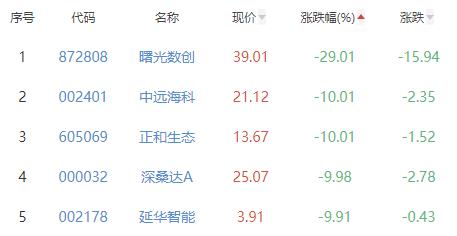 曙光数创、中远海科、正和生态、深桑达A、延华智能位列涨幅榜后五位,涨幅分别为-29.01%、-10.01%、-10.01%、-9.98%、-9.91%。