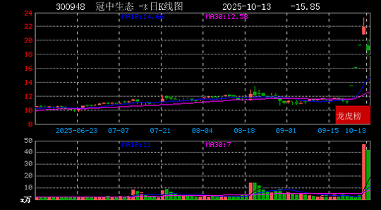 截止收盘,冠中生态报收18.48元/股,涨幅-15.85%,成交量41万手,成交额7.85亿元,换手率31.93%。今日未涨停。