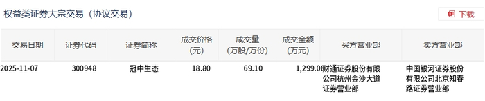 11月7日,冠中生态大宗交易成交69.1万股,成交额1299.08万元,占当日总成交额的4.52%,成交价18.8元,较市场收盘价18.95元折价0.79%。