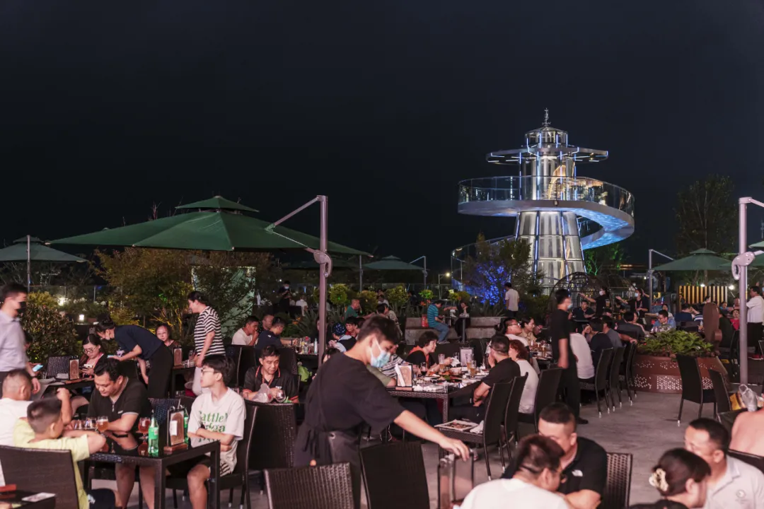 露台上麦芽、啤酒花、酒瓶的装饰烘托起热闹的气氛