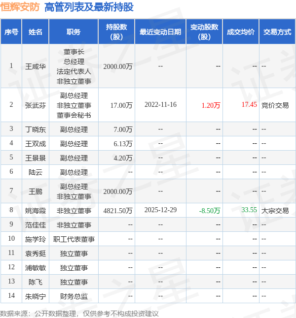 恒辉安防的高管列表及最新持股情况如下: