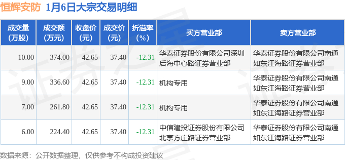 1月6日恒辉安防现4笔折价12.31%的大宗交易 合计成交1196.8万元