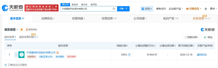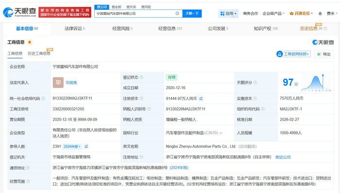 雷达财经讯,天眼查App显示,近日,宁波震裕汽车部件有限公司发生工商变更,注册资本由约6.6亿人民币增至约9.1亿人民币,增幅约38%。