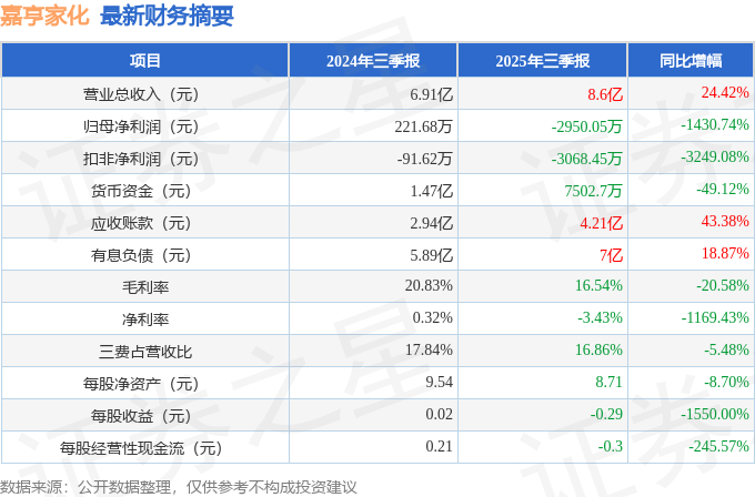 据证券之星公开数据整理,近期嘉亨家化(300955)发布2025年三季报。截至本报告期末,公司营业总收入8.6亿元,同比上升24.42%,归母净利润-2950.05万元,同比下降1430.74%。按单季度数据看,第三季度营业总收入3.46亿元,同比上升28.66%,第三季度归母净利润263.5万元,同比下降65.63%。本报告期嘉亨家化公司应收账款体量较大,当期应收账款占最新年报营业总收入比达45.66%。