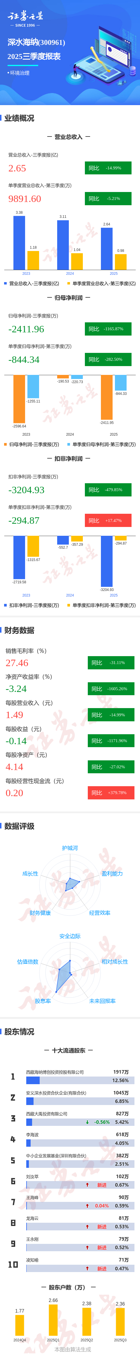 图解深水海纳三季报:第三季度单季净利润同比下降282.51%