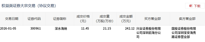 1月5日,深水海纳大宗交易成交21.15万股,成交额242.12万元,占当日总成交额的3.7%,成交价11.45元,较市场收盘价14.44元折价20.71%。