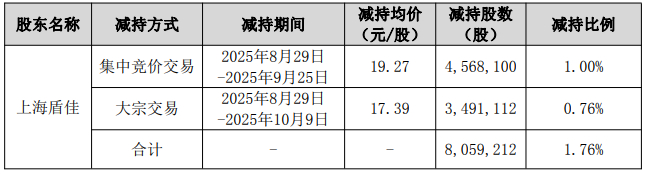 上海盾佳因持股平台股东资金需求在2025年9月16日至2025年10月9日期间,通过集中竞价交易方式累计减持其持有的公司股份1,139,400股,通过大宗交易方式累计减持其持有的公司股份3,088,112股,在此期间合计减持股份占公司总股本的0.92%,公司控股股东、实际控制人冯明明及其一致行动人上海盾佳持有公司股份比例从41.83%下降至40.91%,变动触及1%的整数倍。