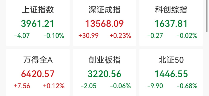 中新经纬12月30日电 30日上午,A股三大指数走势分化,沪指、创业板指下跌。截至午盘,上证指数跌0.10%,报3961.21点;深证成指涨0.23%,报13568.09点;创业板指跌0.06%,报3220.56点。