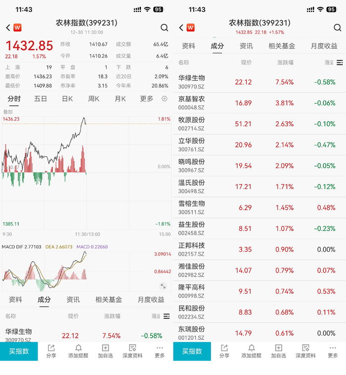临近午盘,农林指数快速拉升,华绿生物涨超7%,京基智农、牧原股份、立华股份等多股上涨。消息面上,中央农村工作会议29日至30日在北京召开。会议强调,农业农村现代化关系中国式现代化全局和成色,必须加快建设农业强国。要稳定粮油生产,加力实施新一轮千亿斤粮食产能提升行动,推动粮食品种培优和品质提升。
