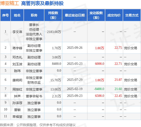 博亚精工的高管列表及最新持股情况如下: