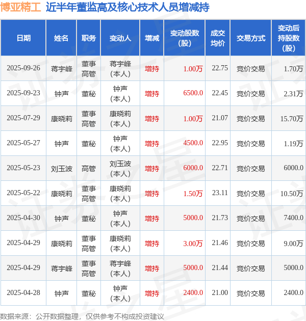 博亚精工近半年内的董监高及核心技术人员增减持详情如下: